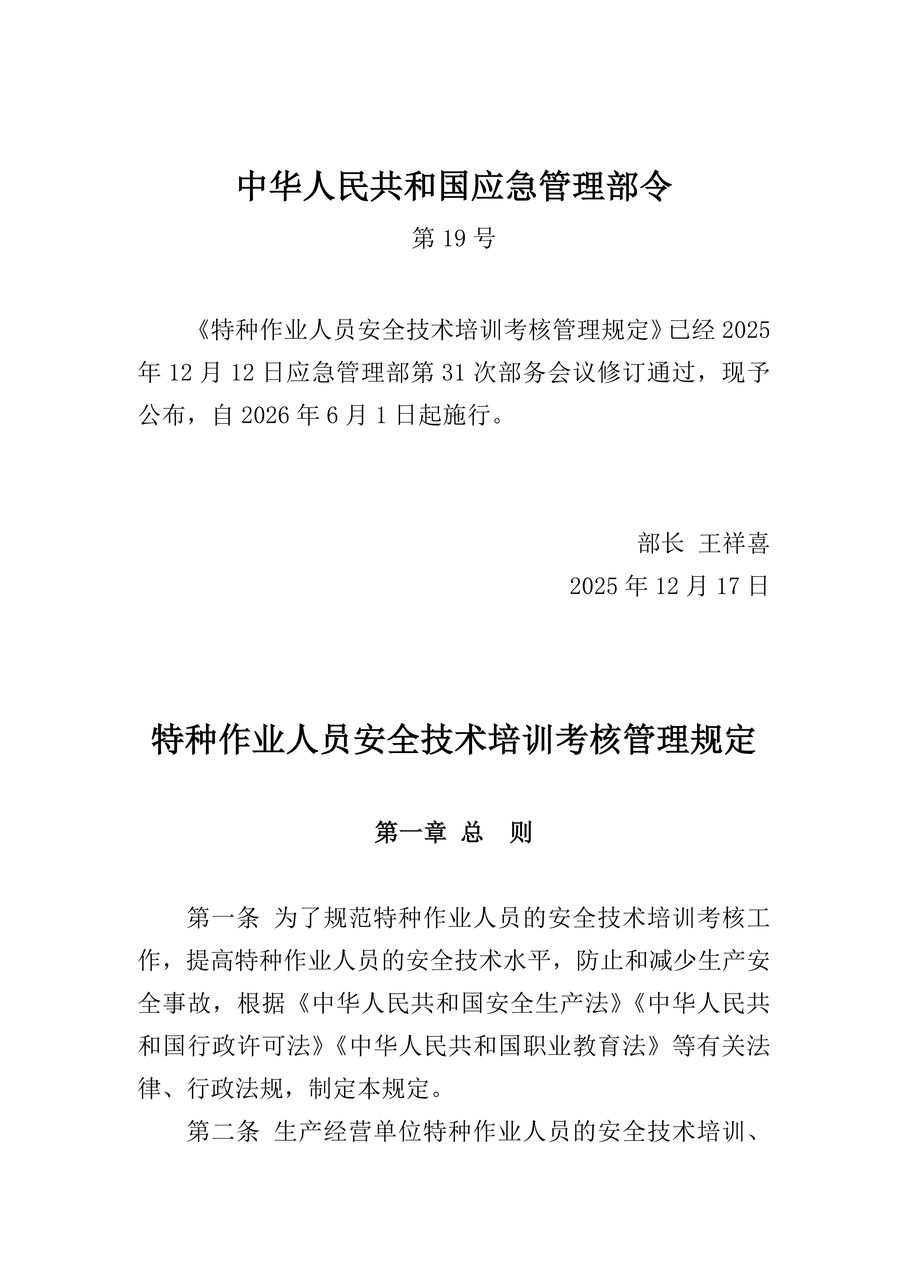 《特种作业人员安全技术培训考核管理规定》(应急管理部令第19号)