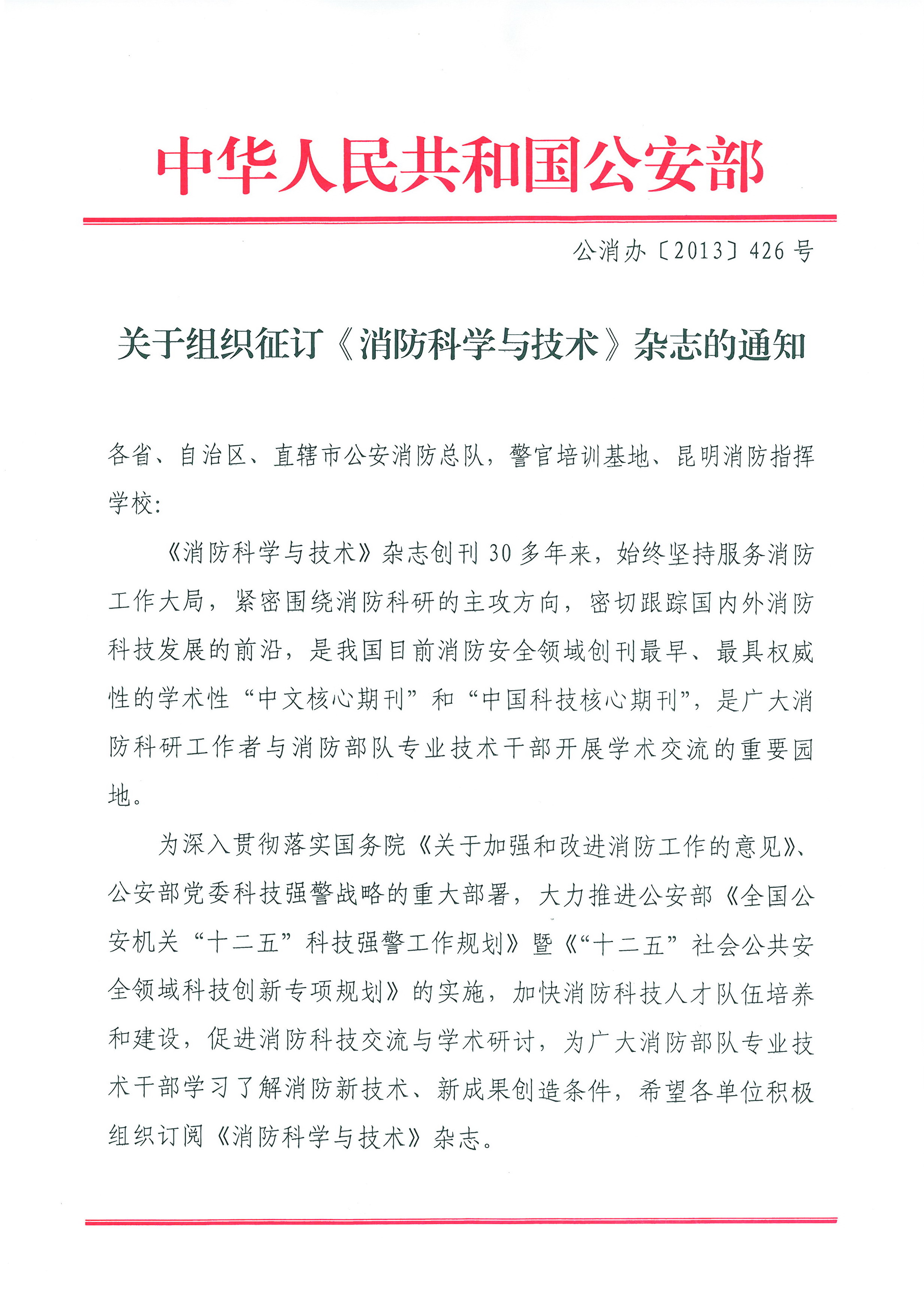 现将“关于组织征订《消防科学与技术》杂志通知”(公消办【2013】426号)转发给你们,希望各单位积极组织订阅。