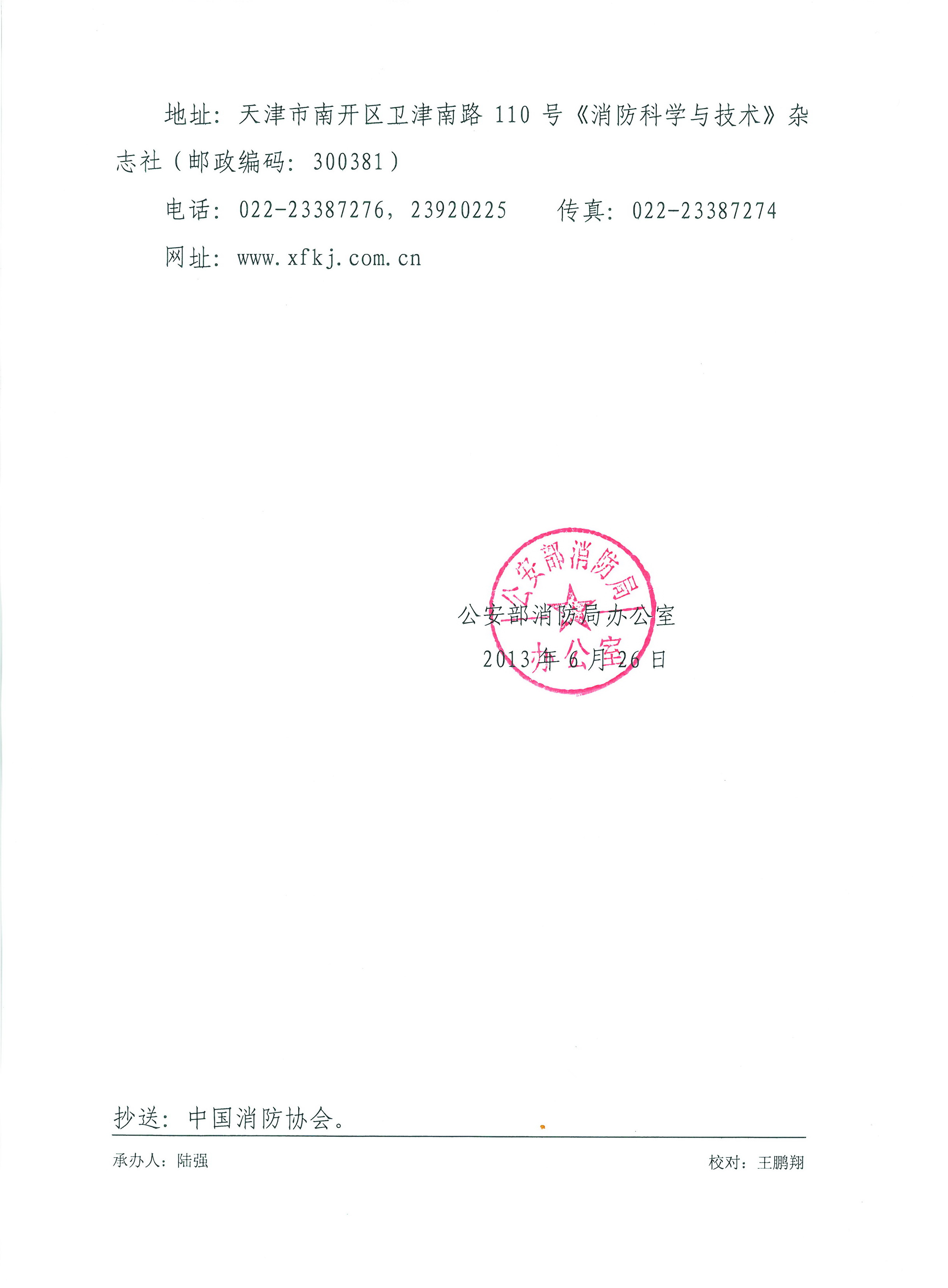 地址:天津市南开区卫津南路110号《消防科学与技术》杂志社(邮政编码:300381)