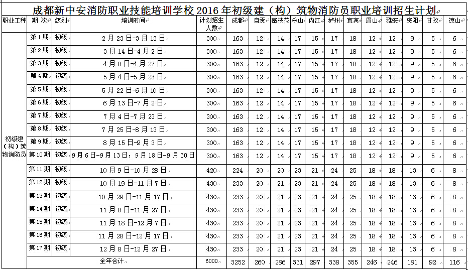 2016年我校共计划举办初级建(构)筑物消防员职业技能培训17期,具体安排如下: